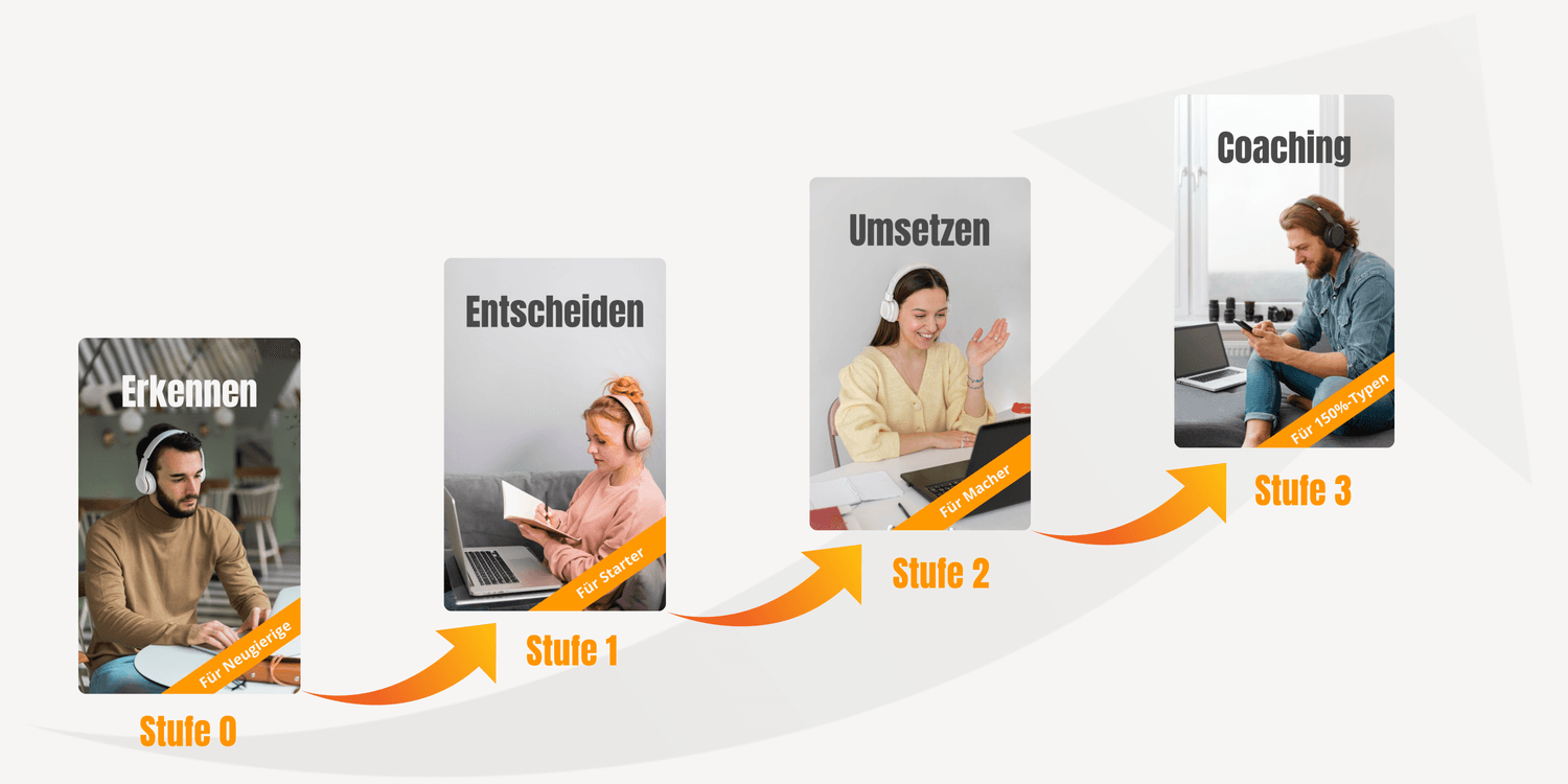 In weniger als acht Stunden, durchläufst du das vollständige Programm (Stufen 0-2) und bist danach nicht nur aufgeklärt, sondern auch im Stande konsequent selbst umzusetzen.