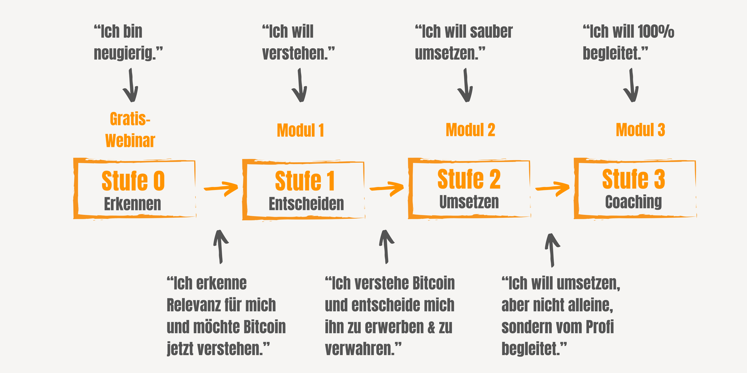 Es folgt einem inneren Konzept und leitet dich konsequent vom Erkennen über das tiefe Verständnis zur stabilen Umsetzung – dem Erwerb und der Verwahrung von Bitcoin.